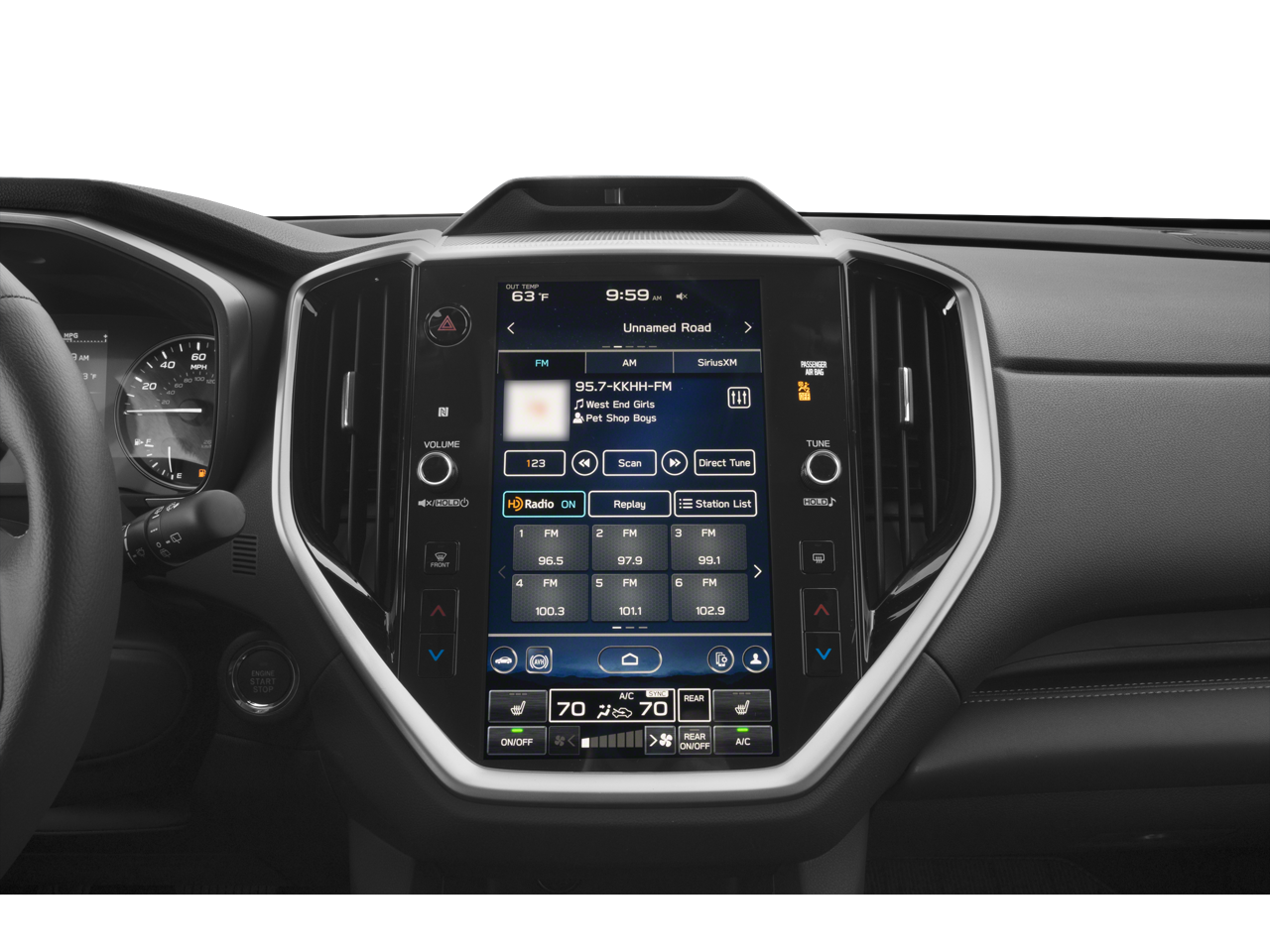 - Radio: Subaru STARLINK 11.6" Multimedia Nav System -inc: AM/FM stereo HD Radio, multi-touch gesture high resolution display screen, voice activated controls for radio and navigation, Bluetooth® audio streaming and hands-free phone connectivity w/SMS text messaging connectivity (refer to subaru.com for cell phone compatibility), Near Field Communication (NFC), TomTom navigation software w/what3words, iPod control capability, SiriusXM All Access radio (4 months free trial included/subscription required after), SiriusXM Traffic (3 years free trial included/subscription required after), SiriusXM Travel Link (3 years free trial included/subscription required after), smartphone integration for Android Auto and Apple CarPlay w/full screen view and wireless connection and STARLINK cloud applications (refer to subaru.com for app availability), USB audio system update, TomTom navigation system update w/USB/Map Over The Air (MOTA) (3 years free map updates), steering wheel control switches for audio and Bluetooth®, harman/kardon quantum logic surround sound speaker system w/14 speakers, subwoofer and harman/kardon 792 watt equivalent maximum output amplifier, 3.5mm illuminated auxiliary input jack and illuminated USB A and C input/charge ports