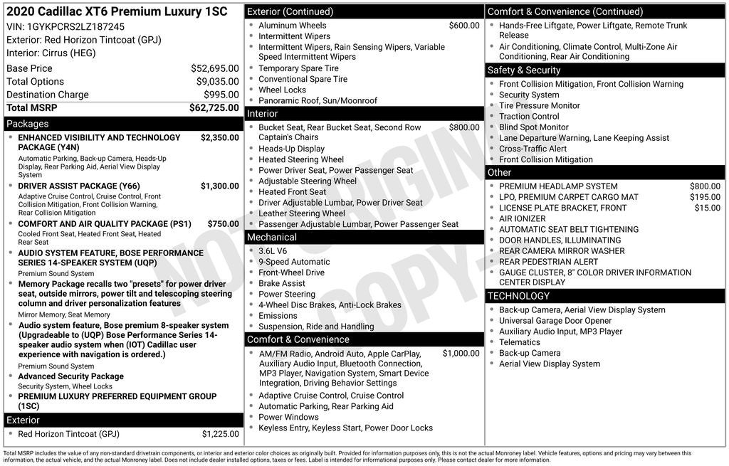 COMPLIMENTARY 3 MONTH 3 THOUSAND MILE COMPREHENSIVE WARRANTY ON QUALIFYING VEHICLES!!! Eastern Shore Nissan is proud to offer this attractive-looking 2020 Cadillac XT6 in Red Horizon Tintcoat This vehicle has passed our comprehensive inspection with flying colors and comes with the following features; Comfort & Air Quality Package (Air Ionizer, Heated Rear Outboard Seating Positions, and Ventilated Driver & Front Passenger Seats), Driver Assist Package (Advanced Adaptive Cruise Control, Automatic Seat Belt Tightening, Enhanced Automatic Emergency Braking, and Reverse Automatic Braking), Enhanced Visibility & Technology Package (8 Color Driver Information Center Display, Automatic Parking Assist w/Braking, HD Surround Vision, Head-Up Display, Rear Camera Mirror, Rear Camera Mirror Washer, Rear Pedestrian Alert, and Surround Vision Recorder), Premium Luxury Package 1SC (Automatic Emergency Braking, Bose Premium 8-Speaker Audio System, Front & Rear Park Assist, and Teen Driver), Radio: Cadillac User Experience w/Embedded Nav (Bose Performance Series Audio System and SiriusXM w/360L), 2-Way Power Driver Lumbar Control Seat Adjuster, 2-Way Power Passenger Lumbar Control Seat Adjuster, 3.49 Axle Ratio, 3rd row seats: split-bench, 4-Wheel Disc Brakes, 6-Passenger Seating, 8 Speakers, ABS brakes, Air Conditioning, Alloy wheels, AM/FM radio: SiriusXM, AppLink/Apple CarPlay and Android Auto, Audio memory, Auto High-beam Headlights, Auto tilt-away steering wheel, Auto-dimming door mirrors, Auto-dimming Rear-View mirror, Automatic Stop/Start w/Disable, Automatic temperature control, Brake assist, Bumpers: body-color, Compass, Delay-off headlights, Driver & Front Passenger Heated Seats, Driver door bin, Driver vanity mirror, Dual front impact airbags, Dual front side impact airbags, Electronic Stability Control, Emergency communication system: OnStar and Cadillac connected services capable, Exterior Parking Camera Rear, Four wheel independent suspension, Front anti-roll bar, Front Bucket Seats, Front Center Armrest, Front dual zone A/C, Front License Plate Bracket, Front reading lights, Fully automatic headlights, Garage door transmitter, Heated door mirrors, Heated front seats, Heated steering wheel, Illuminated entry, Illuminating Door Handles, Knee airbag, Leather Seating Surfaces w/Mini-Perforated Inserts, Leather steering wheel, Low tire pressure warning, Memory seat, Occupant sensing airbag, Outside temperature display, Overhead airbag, Overhead console, Panic alarm, Passenger door bin, Passenger vanity mirror, Power door mirrors, Power driver seat, Power Liftgate, Power moonroof: UltraView, Power passenger seat, Power steering, Power windows, Premium Carpet Cargo Mat (LPO), Premium Headlamp System, Radio data system, Radio: Cadillac User Experience AM/FM Stereo, Rain sensing wipers, Rear air conditioning, Rear anti-roll bar, Rear reading lights, Rear seat center armrest, Rear window defroster, Rear window wiper, Remote keyless entry, Ride & Handling Suspension, Roof rack: rails only, Security system, Speed control, Speed-sensing steering, Split folding rear seat, Spoiler, Steering wheel memory, Steering wheel mounted audio controls, Tachometer, Telescoping steering wheel, Tilt steering wheel, Traction control, Trip computer, Turn signal indicator mirrors, Variably intermittent wipers, Voltmeter, Wheels: 20 12-Spoke Alloy w/Fully Polished Finish, and Wheels: 20 6-Split Spoke Alloy.