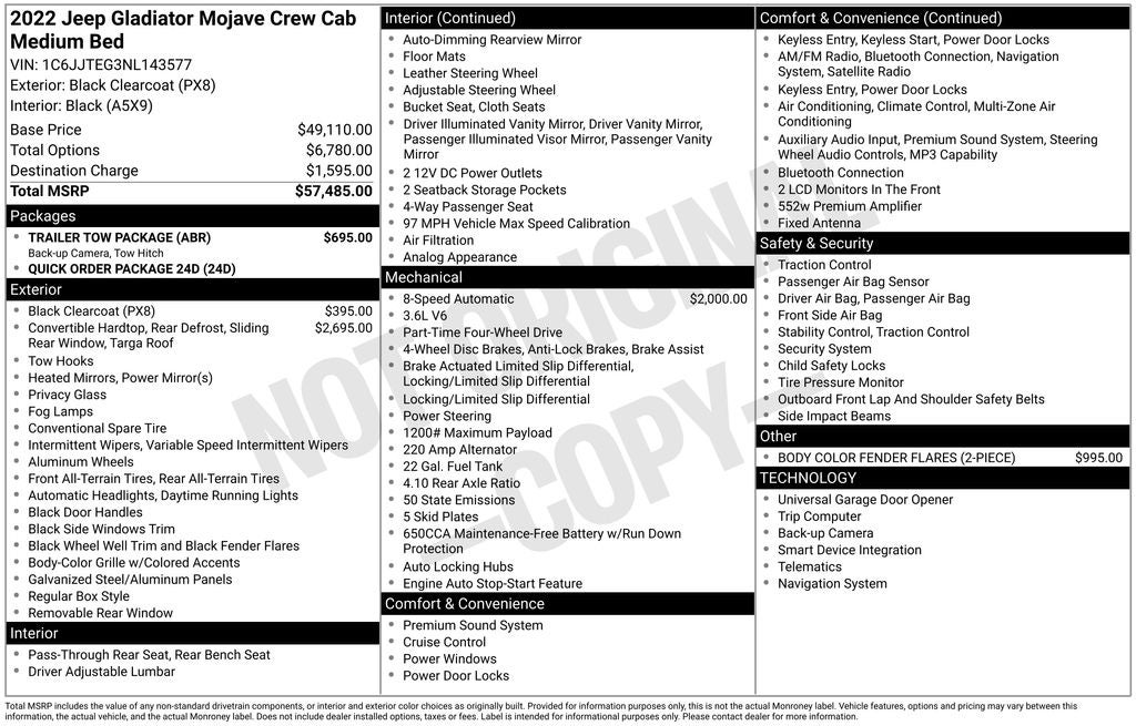 COMPLIMENTARY 3 MONTH 3 THOUSAND MILE COMPREHENSIVE WARRANTY ON QUALIFYING VEHICLES!!! Eastern Shore Nissan is proud to offer this fantastic 2022 Jeep Gladiator in Black Clearcoat This vehicle has passed our comprehensive inspection with flying colors and comes with the following features; Quick Order Package 24D, Trailer Tow Package (240 Amp Alternator, Class IV Receiver Hitch, Heavy-Duty Engine Cooling, and Trailer Hitch Zoom), 4-Wheel Disc Brakes, 4.10 Rear Axle Ratio, 9 Speakers, 97 MPH Vehicle Max Speed Calibration, ABS brakes, Air Conditioning, Alloy wheels, AM/FM radio: SiriusXM, Apple CarPlay/Android Auto, Auto-dimming Rear-View mirror, Automatic temperature control, Body Color 3-Piece Hard Top, Body Color Fender Flares (2-Piece), Brake assist, Compass, Delay-off headlights, Driver door bin, Driver vanity mirror, Dual front impact airbags, Dual front side impact airbags, Electronic Stability Control, Emergency communication system: SiriusXM Guardian, Freedom Panel Storage Bag, Front anti-roll bar, Front Bucket Seats, Front Center Armrest w/Storage, Front dual zone A/C, Front fog lights, Front reading lights, Fully automatic headlights, Garage door transmitter, Heated door mirrors, Heavy Duty Suspension w/Gas Shocks, Illuminated entry, Integrated roll-over protection, Leather steering wheel, Low tire pressure warning, Navigation System, No Soft Top, Occupant sensing airbag, Outside temperature display, Panic alarm, ParkView Rear Back-Up Camera, Passenger door bin, Passenger vanity mirror, Power door mirrors, Power steering, Power windows, Premium Cloth Seats w/Sport Bolsters, Radio data system, Radio: Uconnect 4C Nav w/8.4 Display, Rear anti-roll bar, Rear reading lights, Rear Sliding Window, Rear Window Defroster, Remote keyless entry, Security system, Speed control, Split folding rear seat, Steering wheel mounted audio controls, Tachometer, Telescoping steering wheel, Tilt steering wheel, Traction control, Trip computer, Variably intermittent wipers, Voltmeter, and Wheels: 17 x 7.5 Low Gloss Black Aluminum.