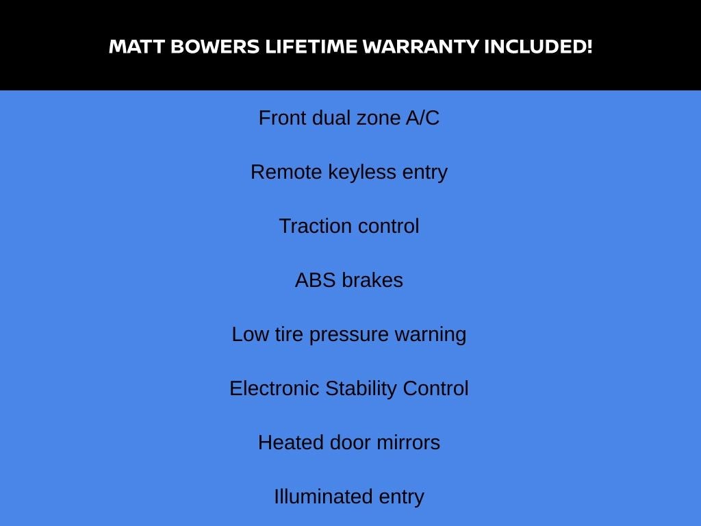 - Front dual-zone air conditioning, remote keyless entry, and electronic stability control
