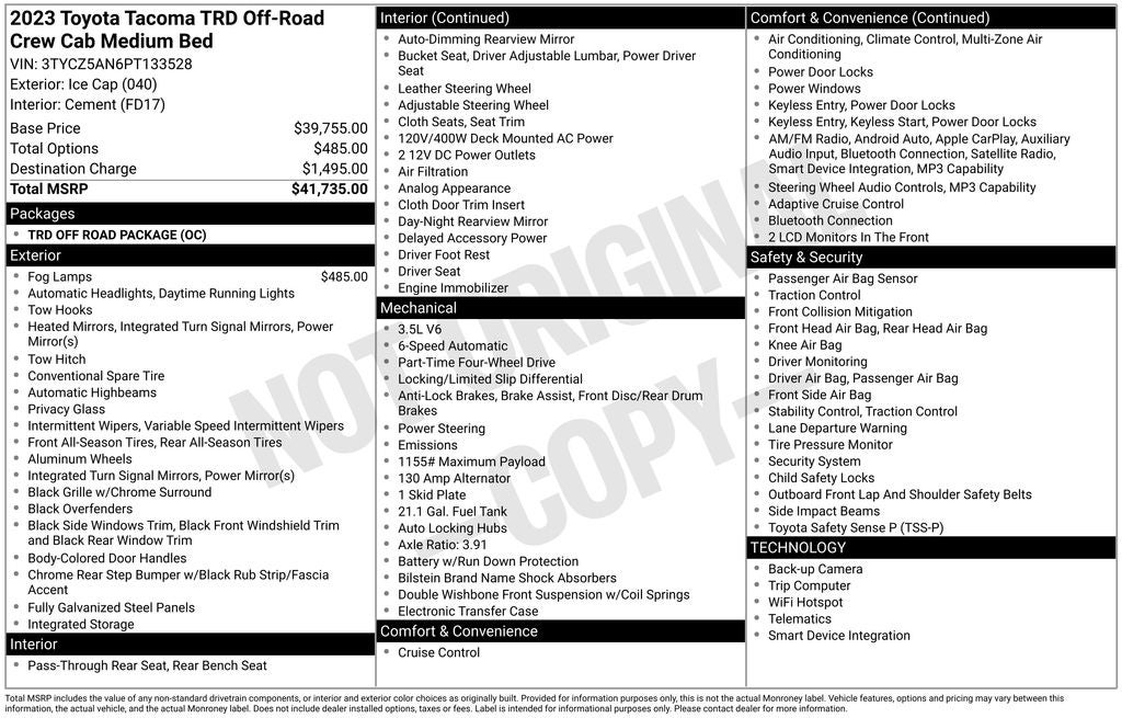 COMPLIMENTARY 3 MONTH 3 THOUSAND MILE COMPREHENSIVE WARRANTY ON QUALIFYING VEHICLES!! Discover the ultimate off-road companion in the 2023 Toyota Tacoma TRD Off-Road V6. This rugged and capable truck is ready to take on any adventure, whether it's conquering the trails or tackling your daily commute.