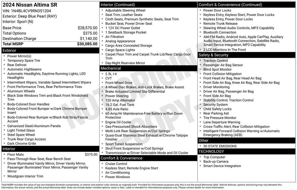 COMPLIMENTARY 3 MONTH 3 THOUSAND MILE COMPREHENSIVE WARRANTY ON QUALIFYING VEHICLES!!! Eastern Shore Nissan is proud to offer this beautiful 2024 Nissan Altima in Deep Blue Pearl This vehicle has passed our comprehensive inspection with flying colors and comes with the following features; CVT with Xtronic, 4-Wheel Disc Brakes, 6 Speakers, ABS brakes, Air Conditioning, Alloy wheels, AM/FM radio: SiriusXM, Auto High-beam Headlights, Blind Spot Warning, Brake assist, Bumpers: body-color, Delay-off headlights, Driver door bin, Driver vanity mirror, Dual front impact airbags, Dual front side impact airbags, Electronic Stability Control, Four wheel independent suspension, Front anti-roll bar, Front Bucket Seats, Front Center Armrest, Front reading lights, Fully automatic headlights, Illuminated entry, Knee airbag, Leather Shift Knob, Low tire pressure warning, NissanConnect featuring Apple CarPlay, Occupant sensing airbag, Outside temperature display, Overhead airbag, Overhead console, Panic alarm, Passenger door bin, Passenger vanity mirror, Power door mirrors, Power driver seat, Power steering, Power windows, Radio data system, Radio: AM/FM Audio System, Rear anti-roll bar, Rear Parking Sensors, Rear reading lights, Rear seat center armrest, Rear side impact airbag, Rear window defroster, Remote keyless entry, Security system, Speed control, Speed-sensing steering, Speed-Sensitive Wipers, Split folding rear seat, Sport Seat Trim, SR Floor Mats/Trunk Mat/Hideaway Nets, Steering wheel mounted audio controls, Tachometer, Telescoping steering wheel, Tilt steering wheel, Traction control, Trip computer, Unique Sport Seats, Variably intermittent wipers, and Wheels: 19 Sport Alloy. CVT with Xtronic.